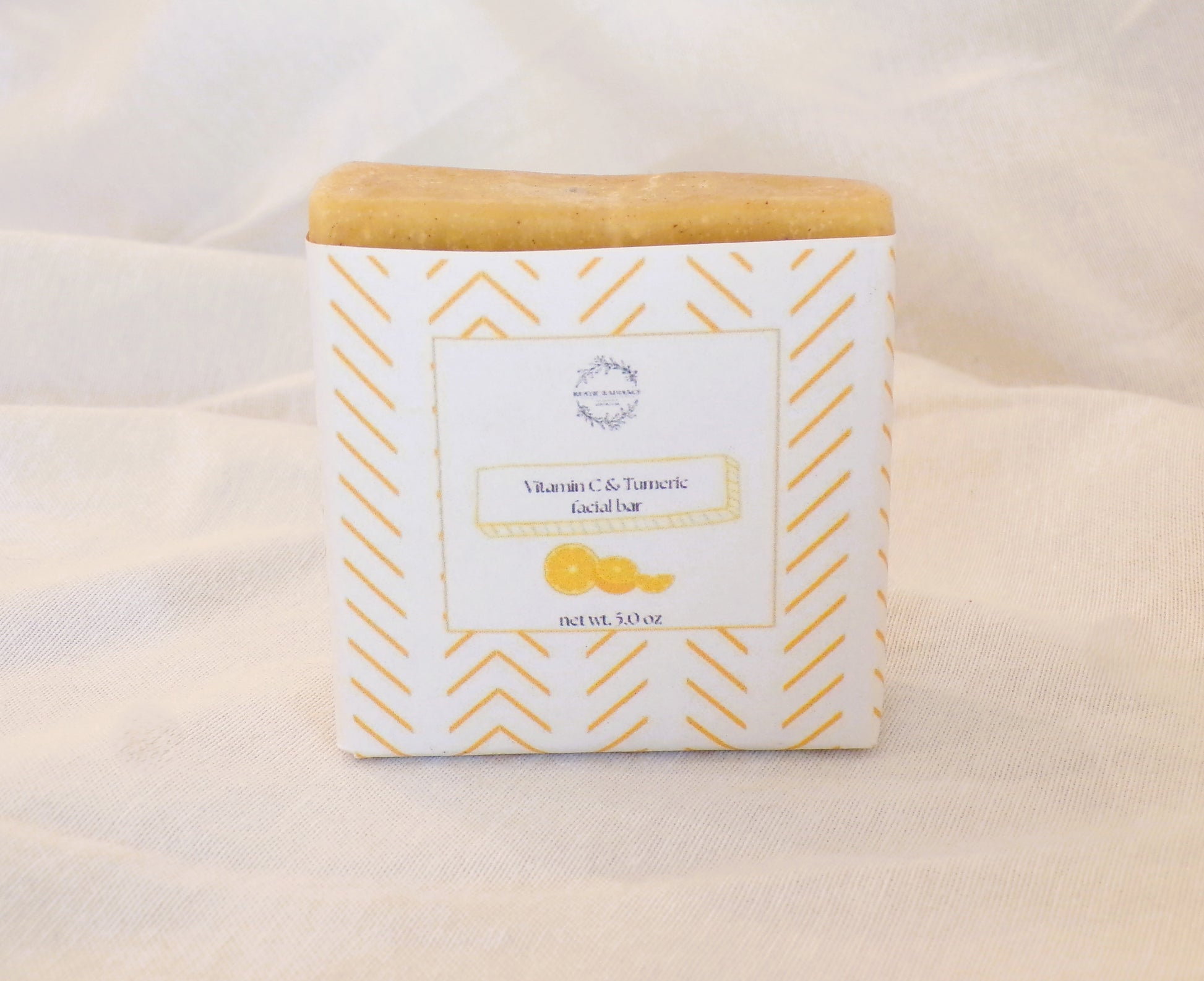 Ingredients: Organic coconut oil, castor oil, water, lye, turmeric powder, vitamin c serum, sweet orange oil.